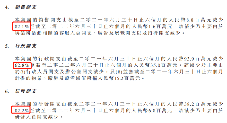 經營業績的驟降,思考樂首先能做的是控制費用開支。2022年上半年,公司的銷售開支同比下降82.1%至160萬元,行政開支縮減62.8%至3500萬元,研發開支壓縮82.2%至680萬元。
