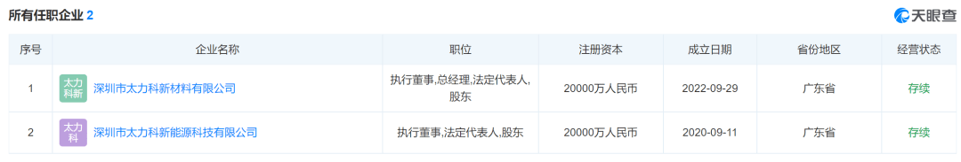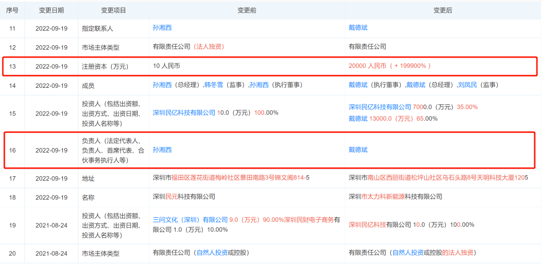 太力科原名為深圳民元科技有限公司,法定代表人為孫湘西,創(chuàng)立于2020年9月,注冊(cè)資本為10萬(wàn)元。而在2022年9月19日,該公司負(fù)責(zé)人則由孫湘西換為戴德斌,注冊(cè)資本更是激增至2億元。