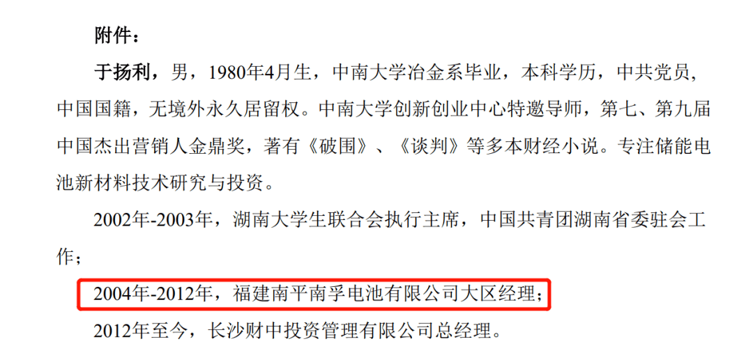 據(jù)當(dāng)時(shí)的公告簡(jiǎn)歷顯示,于揚(yáng)利曾于2004年至2012年間擔(dān)任福建南平南孚電池大區(qū)經(jīng)理。2012年后,其一直擔(dān)任私募投資機(jī)構(gòu)長(zhǎng)沙財(cái)中投資管理有限公司總經(jīng)理。公告指出,于揚(yáng)利專注儲(chǔ)能電池新材料技術(shù)研究與投資。