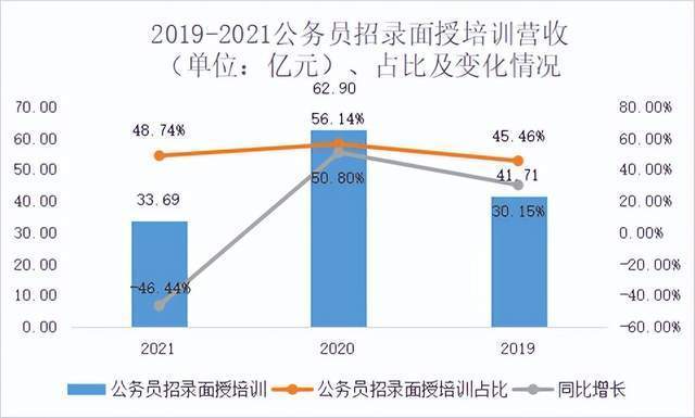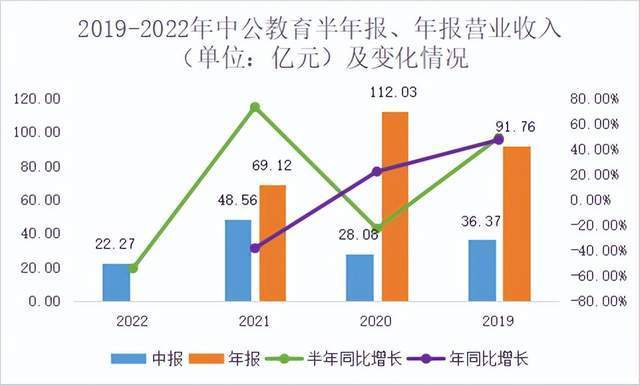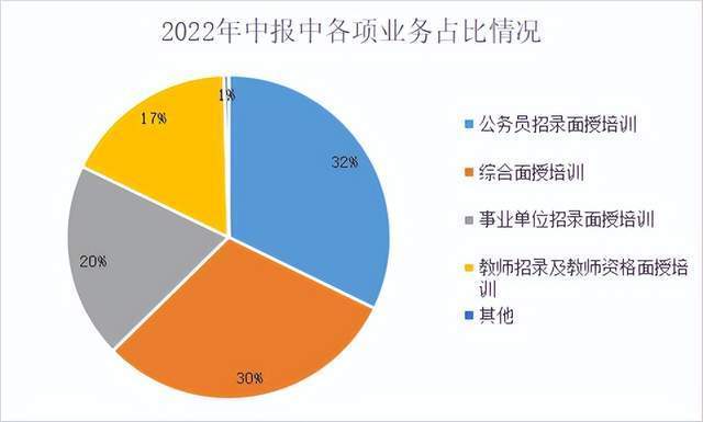 其中,長期占營業收入一半的“公務員招錄培訓面授業務”在2021年急轉直下,相比去年同期少了30億元收入,這也是導致其2021年總收入大幅下滑的主要原因。而2022年中報顯示,公務員招錄面授培訓的占比僅為32%,營收僅7.18億元,相對去年同期下滑了68.98%,情況不容樂觀。