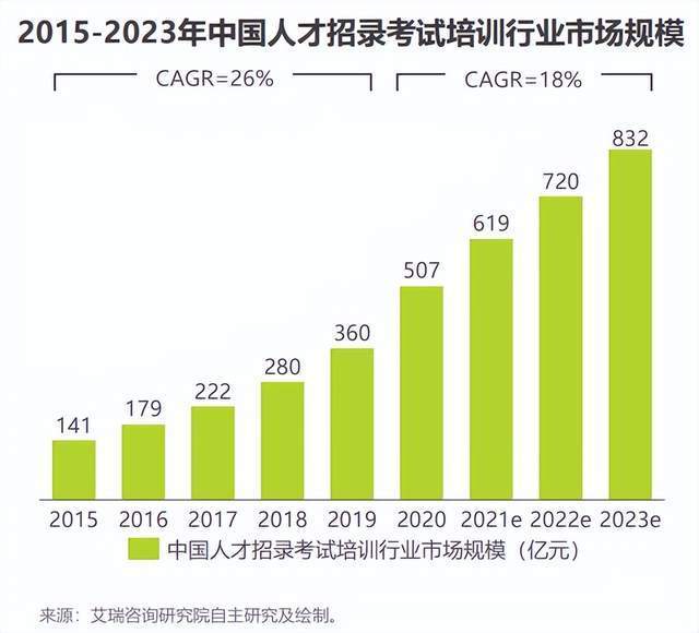 公務員熱讓公考、編考培訓行業市場規模的快速增長。艾瑞咨詢研究院的數據顯示,近年來競爭越來越激烈,尤其是在疫情開始的2020年,參培率達到了31.7%。根據預測,到2023年人才招錄市場規模有望達到832億元,整體發展較為迅速。