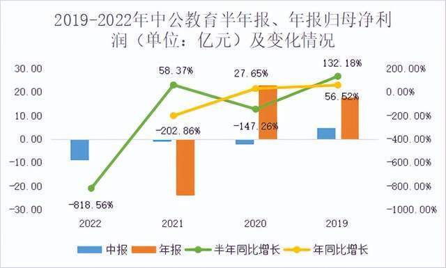 出乎所有人意料,雖然市場一片火熱,中公教育卻有些“冷”。從2019-2022年營收、凈利潤上來看,其表現與火熱的外部環境恰恰相反——營業收入持續下滑,尤其是近兩年:2021年同比下滑38.30%,而今年中期的下滑更是高達54.15%,營收直接腰斬。