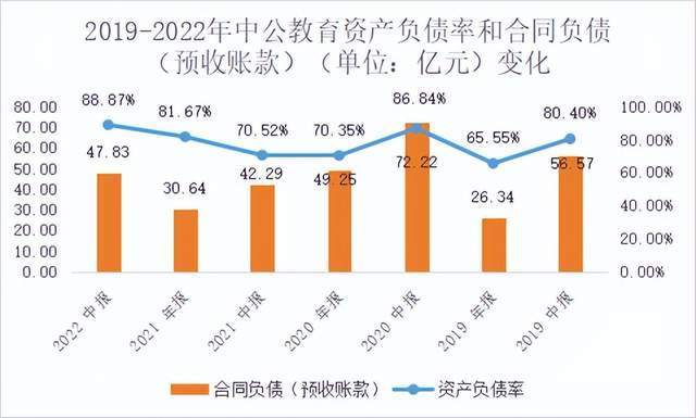由于營業收入和盈利能力大幅下降,中公教育的負債率和現金流都遭遇較大沖擊。在中公教育所處的教育板塊中共有18家企業(去除ST股票,數據來源ifind),2022年中報披露的平均資產負債率為42.68%,而中公教育資產負債率為88.87%,遠超于行業平均水準,財務風險較高。由于中公教育推行“協議保過班”,即先收費上課,如果未通過考試,則全額退費。在這種營業模式下,收取的費用先計入了合同負債(2020年之前記為預收賬款),因此產生了大量負債。