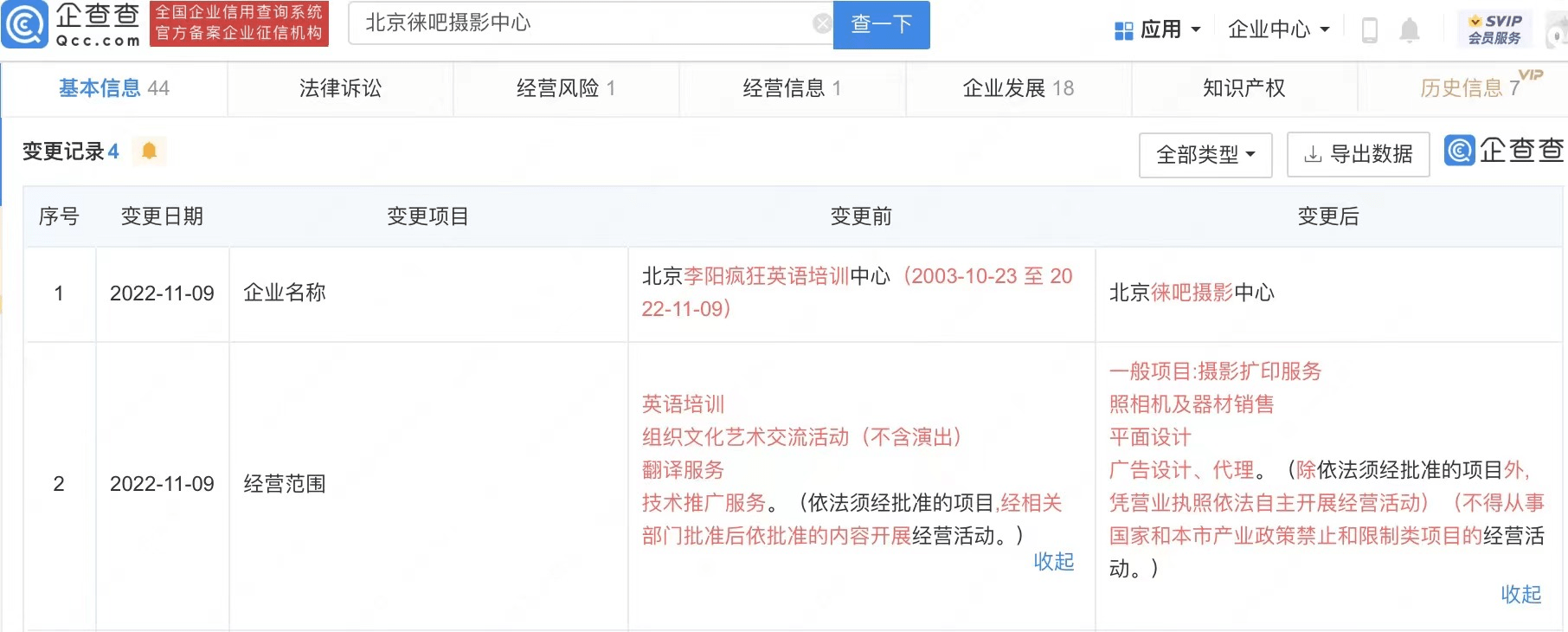 原標(biāo)題:企查查顯示 北京李陽(yáng)瘋狂英語(yǔ)培訓(xùn)中心更名為北京徠吧攝影中心