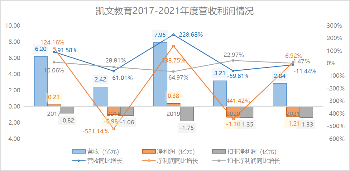 2021年9月起,凱文教育旗下北京海淀凱文學校和北京市朝陽區凱文學校不再納入合并報表范圍,其營收受到較大影響,2021年共計營收2.84億元,同比減少11.44%;虧損1.21億元。