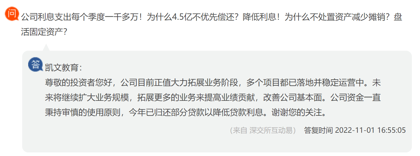 值得注意的是,凱文教育前三季度利息費用達4033.28萬元,上年同期則高達4971.89萬元,而截至2022年9月30日,凱文教育手中現金余額達4.53億元。連年虧損,利息費用卻一直居高不下,手中現金又十分充裕。這引起了投資人的質疑,詢問公司有4.5億現金,為何不優先償還以降低利息,或處置資產減少攤銷以盤活固定資產。