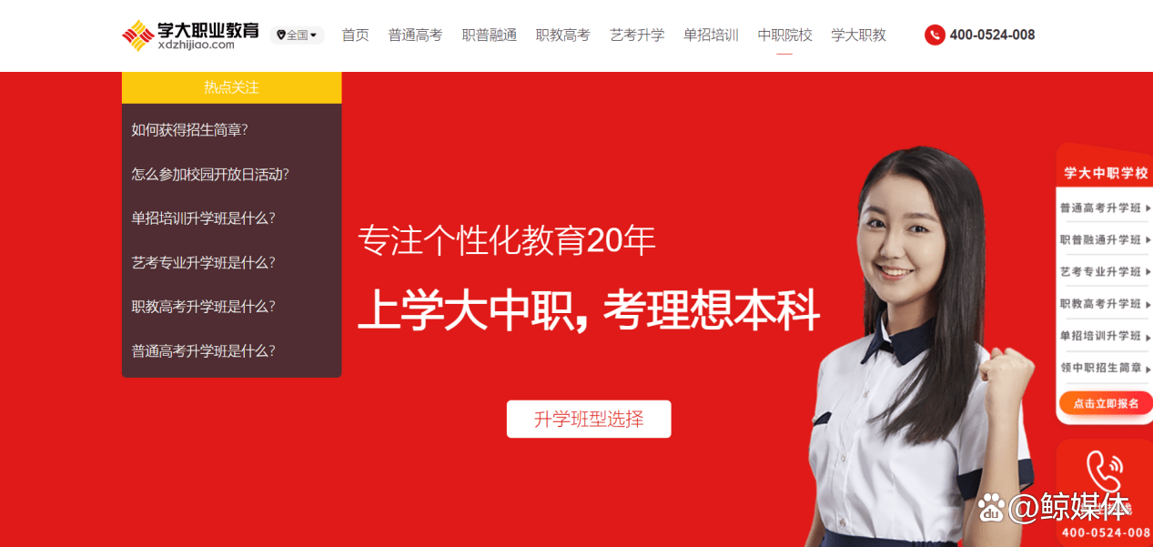 在學大職業(yè)教育官網(wǎng),可以看到醒目的標語“上學大中職,考理想本科”,面向不同升學方向,主要有普通高考升學班,職普融通升學班、藝考升學班、職教高考升學班、單招培訓升學班五類中職升學班型。就目前而言,學大對中職升學業(yè)務有著更多側(cè)重。