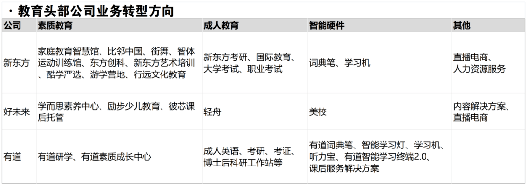 (1)從轉(zhuǎn)型方向來看,為應(yīng)對(duì)政策急變,新東方、好未來及網(wǎng)易有道在圍繞素質(zhì)教育、成人教育、教育硬件以及電商等多方面有不同著重點(diǎn)的布局。頭部企業(yè)具有整合優(yōu)勢(shì),新東方、好未來、有道在渠道、技術(shù)與學(xué)習(xí)內(nèi)容方面的優(yōu)勢(shì),有機(jī)會(huì)進(jìn)一步整合新的細(xì)分市場(chǎng)。
