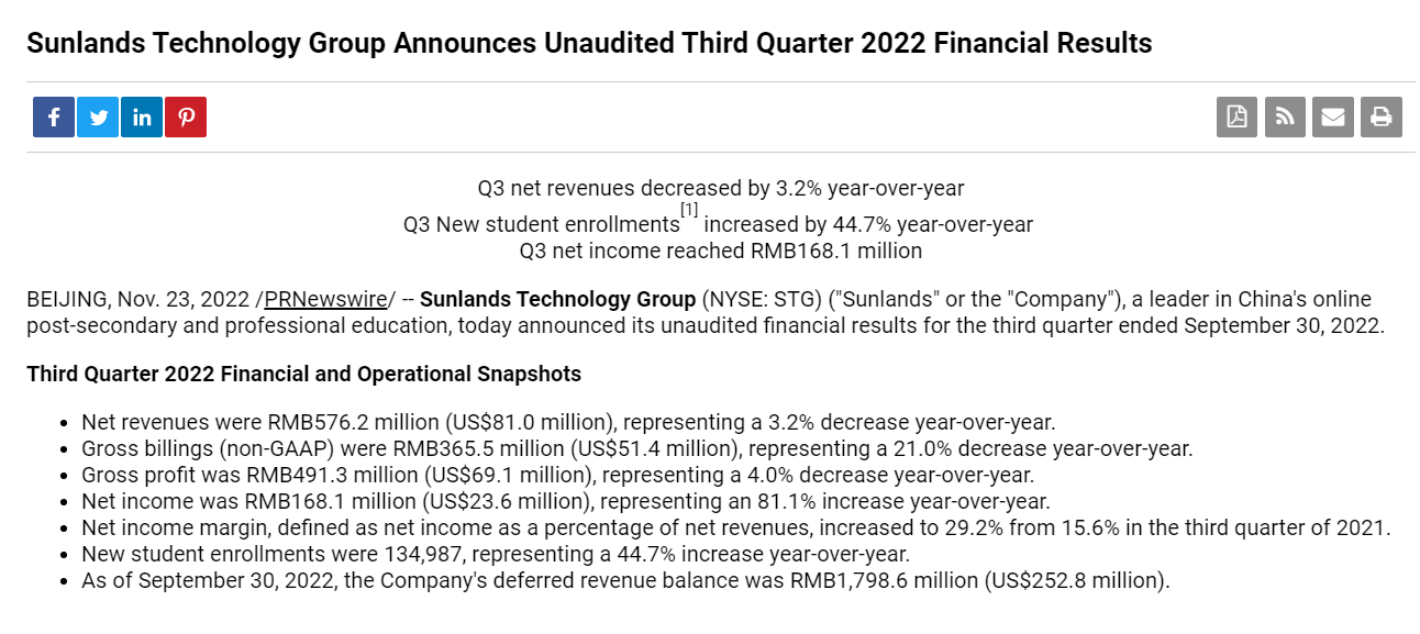 芥末堆文 11月23日,尚德機構發布截至2022年9月30日的第三季度未經審計財務業績。財報顯示,報告期內,尚德機構實現凈收入5.762億元,同比下降3.2%;凈利潤為1.681億元,同比增長81.1%;新生入學人數為134987人,同比增長44.7%。
