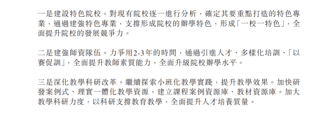 在未來展望上,希望教育給出的第一條便是“堅持質量優先發展戰略”。其表示,將建設特色院校、建強教師隊伍、深化教學科研改革。