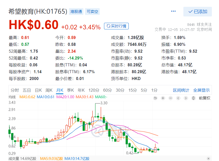 另一方面,持續擴張下,希望教育在資本市場沒有獲得足夠的認可。目前,希望教育的股價已跌成仙股。今年5月其股價一度跌至0.42港元,創造了上市以來的新低。在此背景下,希望教育通過資本市場融資的渠道并不理想,這也是擺在希望教育面前的一個難題。