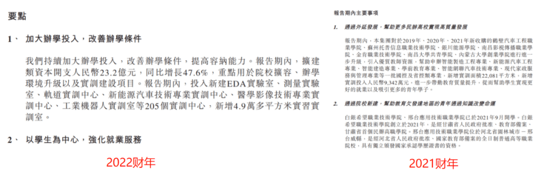 或許是意識到了擴張帶來的問題,在2022財年的年報中,希望教育在財報要點欄目中,著重介紹了與提高教學質量相關的動作。比如,希望教育提到“提高辦學質量”、“強化就業服務”、“打造優秀師資隊伍”、“提升就業創業能力”、“推進職業教育國際化”。但在2021年,希望教育則著重提到了外延發展。