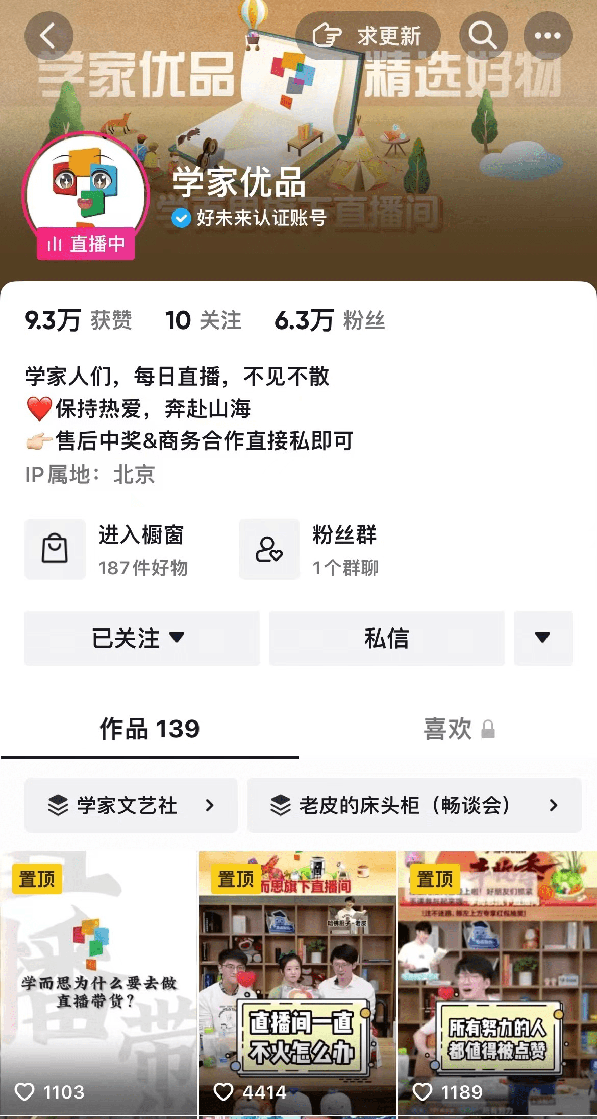 11月7日,在“雙十一”前夕,學而思正式發布全品類抖音電商直播間“學家優品”,截止目前,學家優品共有9名主播,粉絲6.3萬。