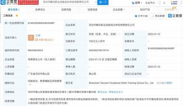 騰訊成立職業技能培訓學校公司 注冊資本100萬元人民幣