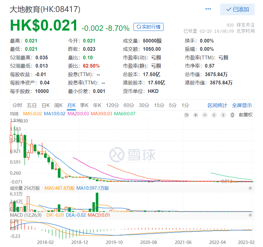 持續虧損的業績疊加想象空間有限的業務,讓大地教育在資本市場上幾乎無人問津。截至2023年2月20日,公司股價為0.021港元,當日跌幅為8.7%,成交量為5萬股,換手率0%,這樣低股價、低成交量、低換手率的情況已經持續了近四年的時間。