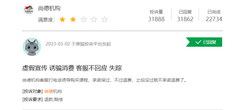 從尚德新課程的規劃、新增學員數量來看,一切似乎都很美好,但在黑貓投訴等投訴平臺,涉及尚德機構的投訴量高達3萬條,“退費難”成為投訴榜單上的高頻詞。此外,尚德機構的投訴內容還包括“誘導貸款”“虛假宣傳”“霸王條款”等。近年來,尚德機構還因違反價格法、廣告法等法律條款,多次受到監管處罰。