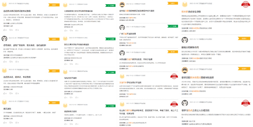 另外,關于上述明星品牌,近期在互聯網平臺上的用戶投訴層出不窮。在黑貓投訴上,不乏關于各地新東方烹飪、萬通汽車、歐米奇西餐學院的投訴,其中關于誘導學員貸款,以及解約違約金陷阱、退費難等問題,成為投訴焦點。