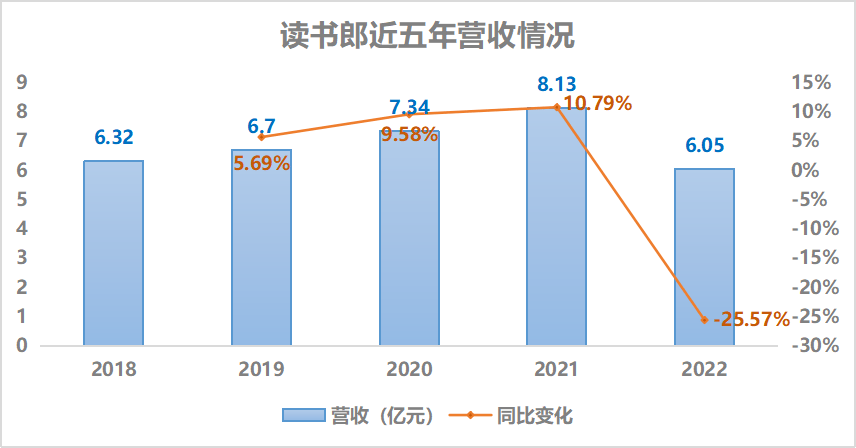 年內,讀書郎營收共計6.05億元,同比減少了約25.6%。而2022年度的大幅下降,也徹底打破了讀書郎營收持續漲勢。對比近五年的營收數據可以發現,2022年度,讀書郎的營收觸及五年來的最低值,低于2018年度的水平。