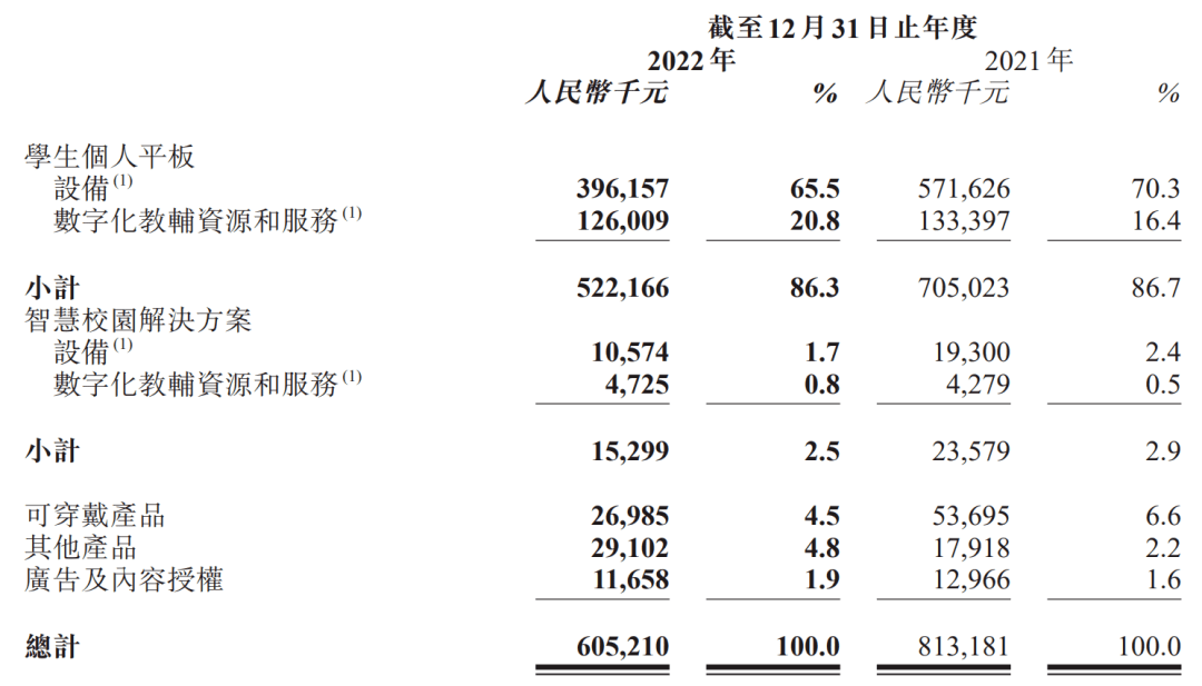 截至2022年底,讀書郎共有四項業務,其中包括學生個人平板、智慧校園解決方案、可穿戴產品,以及包括智能點讀筆、智能掃讀筆及智能化學習桌椅等教學配件在內的其他產品。另外,讀書郎也會通過廣告及內容授權產生收入。