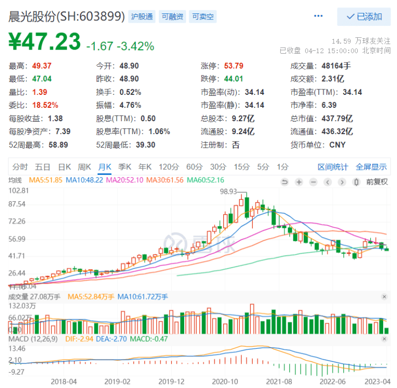 財報顯示,晨光全年實現營收199億元,同比增長13.57%,增速創近五年新低。歸母凈利潤同比減少15%至12.8億元,上市以來公司年度凈利同比首次出現下降。截至2023年4月12日,公司股價報收47.23元/股,與最高點98.93元相比已經腰斬。
