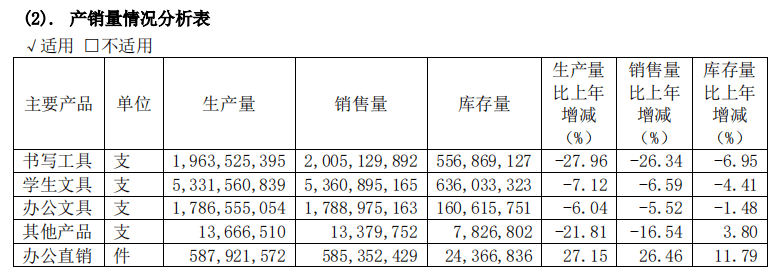 傳統業務方面,除學生文具收入同比小幅增長外,書寫工具、辦公文具、其他產品期內分別實現營收21.69億元、32.23億元、4.71億元,同比減少23.09%、減少3.44%、減少14.12%,核心業務線下滑頹勢明顯。而收入的下降和銷量減少或許有一定關聯,書寫工具、學生文具、辦公文具、其他產品2022年銷售量同比分別下降26.34%、6.59%、5.52%、16.54%,都出現了顯著的減少。