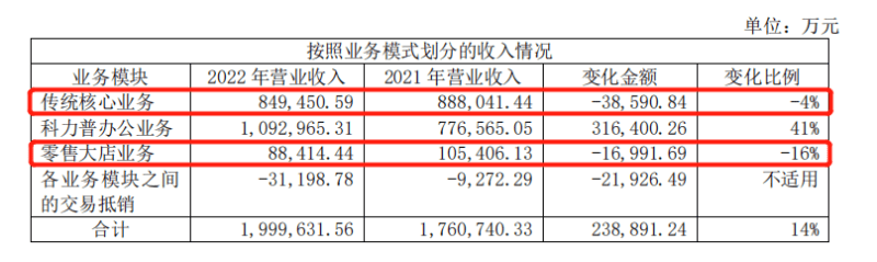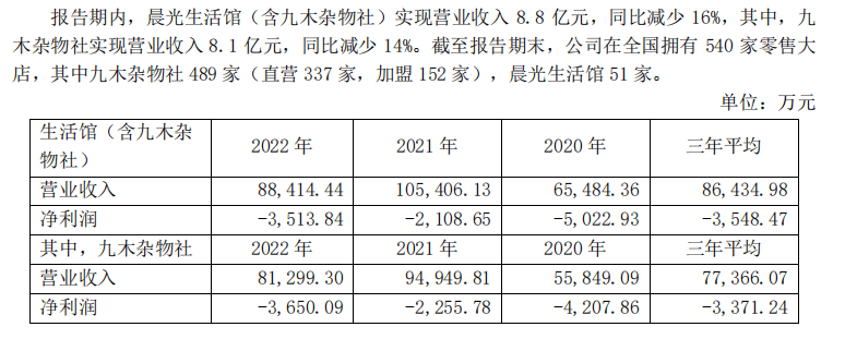 公司全年實現營收199億元,同比增長13.57%,但增速卻創下了近五年的新低。財報指出,2022年公司優勢的傳統核心業務和零售大店業務受到了極大的不利影響,傳統核心業務較去年同期減少4%,零售大店業務的晨光生活館和九木雜物社近三年一直處于虧損態勢,2022年營收同比減少16%至8.8億元,凈虧損3513.84萬元,同比擴大67%。