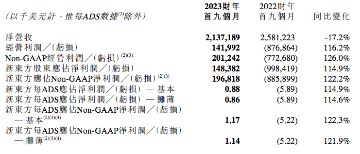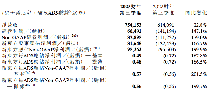 新東方2023財年前三季度業績概要: