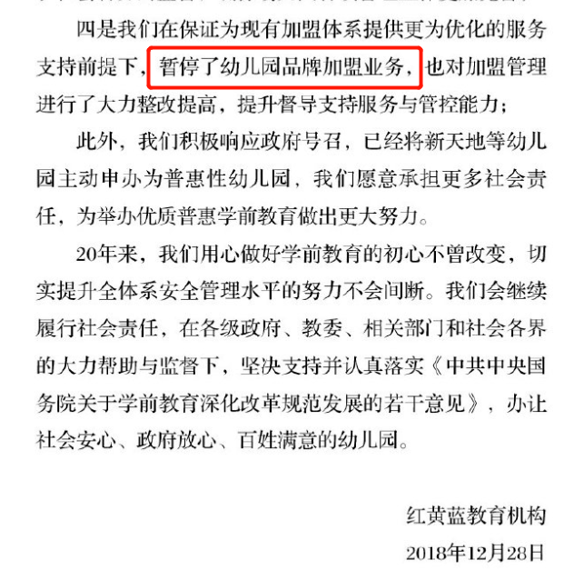 2018年虐童案一審宣判,紅黃藍官方微博曾宣布暫停幼兒園品牌加盟業務,優化提升對現有加盟商服務支持與管理。但似乎未見成效。2019年7月黑外教猥褻兒童事件,2021年4月“聞腳”事件,這一系列安全問題仍然偶有發生。