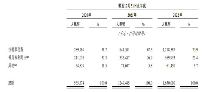 2020年—2022年,第四范式的研發開支分別為5.66億元、12.49億元、16.5億元,三年內增幅超過190%,占比總營收分別為57.3%、55.3%、48.8%。招股書指出,研發開支主要由技術服務費、雇員福利開支、其他組成,尤其是技術服務費,近三年分別錄得2.9億元、8.41億元、12.19億元,占比研發開支分別為51.2%、67.3%、73.9%,呈連年上漲的趨勢。