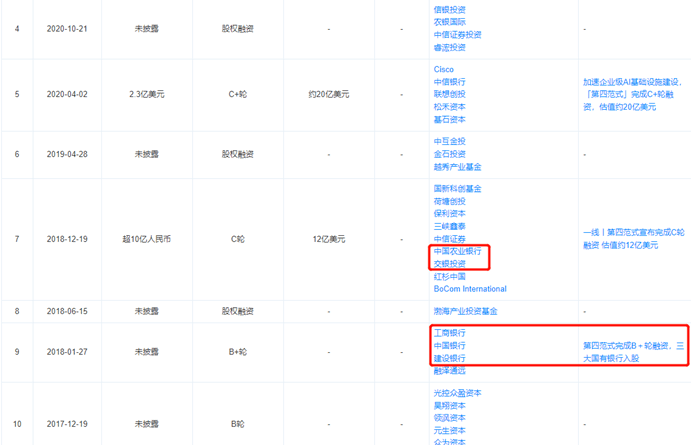天眼查顯示,2015年至今,第四范式已經經歷11輪融資。資方不僅有紅杉中國、騰訊投資、高盛集團、創新工場等,更引人矚目的是,2018年初,公司獲得來自中國工商銀行、中國銀行、中國建設銀行等三家國有銀行及所屬基金的聯合戰略投資。當年年底,第四范式引入中國農業銀行、交通銀行旗下交銀投資等戰略股東,完成超過10億元的C輪融資。至此,第四范式成為少見的五大行均參與投資的創業公司。