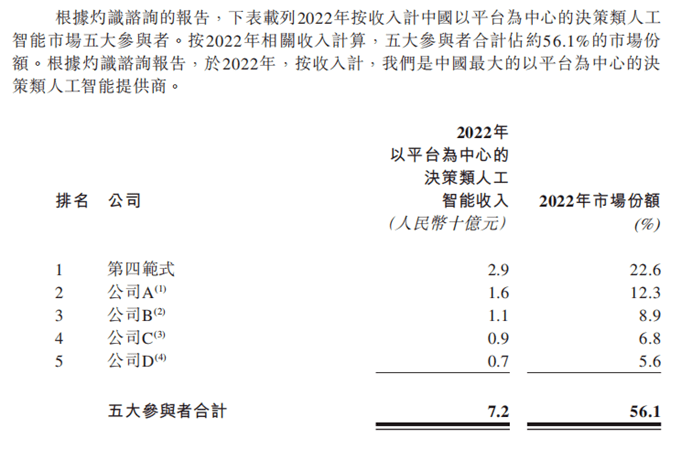 在“天才科學家”的帶領和全明星資方護航下,第四范式很快也成為了決策類AI領域的龍頭企業。根據灼識咨詢的報告,按2022年相關收入計算,第四范式是中國最大的以平臺為中心的決策類AI提供商,占整個市場份額約22.6%。排在其之后的公司A、B、C、D2022年市場所占份額分別為12.3%、8.9%、6.8%、5.6%,外界推測其可能分別為百度、阿里、華為、騰訊。