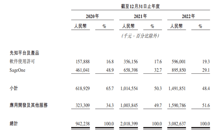 招股書顯示,2020年-2022年,第四范式的收入分別為9.42億元、20.18億元、30.83億元,三年內營收規增福超過兩倍。各報告期,公司的毛利分別為4.3億元、9.53億元、14.87億元,毛利率分別為45.6%、47.2%、48.2%,呈現出迅猛的增勢。具體拆分來看,第四范式的收入主要來源于軟件使用許可、SageOne、應用開發及其他服務。2022年,軟件使用許可、SageOne、應用開發及其他服務分別實現收入5.96億元、8.96億元、15.91億元,分別占比總收入19.3%、29.1%、51.6%。