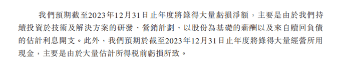 三年累超40億元的虧損并不是終點,招股書中,第四范式坦言,預計截至2023年12月31日止年度將錄得大量虧損凈額,主要由于公司持續投資于技術及解決方案的研發、營銷計劃、以股份為基礎的薪酬以及來自贖回負債的估計利息開支。此外,公司預期2023年將錄得大量經營所用現金,主要是由于大量估計所得稅前虧損所致。