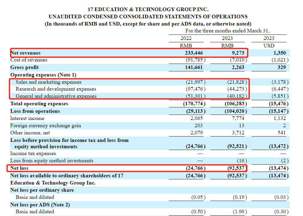 然而,一起教育卻沒能順利邁入這樣的發展階段。最近發布的財報顯示,其2023年一季度凈收入大幅下滑96%,期內凈虧損擴大273.7%。