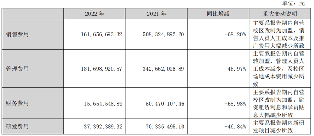 至2023年一季度,開元教育的各項費用仍在大幅度收縮。因校區轉加盟,開元教育一季度其營業成本同比減少51.51%;銷售費用同比減少80.27%,主要由于報告期內恒企教育及天琥教育校企自營轉加盟后,銷售人員人工成本及推廣費用大幅減少;管理費用減少32.24%,主要由于上述校區自營轉加盟后,管理人員人工成本減少且校區場地成本費用減少;研發費用同比減少52.24%,為期內新研發項目減少;財務費用同比減少89.03%;主要也是由于上述校區自營轉加盟后,融資租賃利息及學員貼息大幅減少。