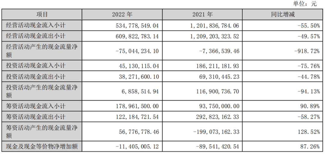 除了撲朔迷離的營收情況,改制也對開元教育的現金流帶來了影響,2022年,開元股份經營活動產生的現金流量凈流出額為7504.42萬元,較上年同期的736.65萬元擴大了918.72%。