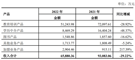 在回復函中,開元教育坦言,公司2022年的營業收入同比2021年變動較大,主要系自營校區改制為加盟校區所影響,導致教育培訓產品收入下降,加盟業務產品收入上漲。