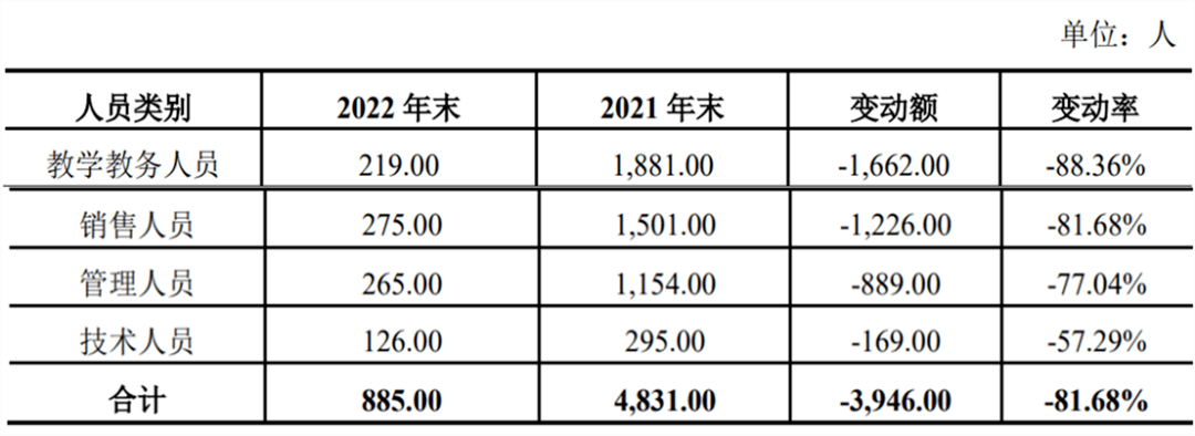 與此同時,據《關于2021年度審計報告與持續經營重大不確定性段落無保留意見涉及事項影響已消除的專項說明》顯示,開元教育2022年末開元教育在職員工的數量合計885人,較2021年末減少3946人。