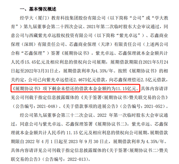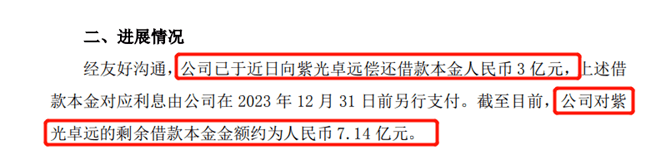 月初,學大教育剛剛還完對芯鑫保理的1.01億借款。7月10日,學大向紫光卓遠償還借款本金3億元,目前,剩余借款本金金額約為7.14億元。