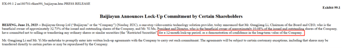 與此同時,在今年6月,百家云發布公告稱,基于對公司未來發展的信心及支持公司長遠健康發展的初心,同時為維護公司價值及股東權益,百家云集團董事長李鋼江及百家云集團總裁馬義宣布作出鎖定承諾,并簽署書面鎖定期協議。