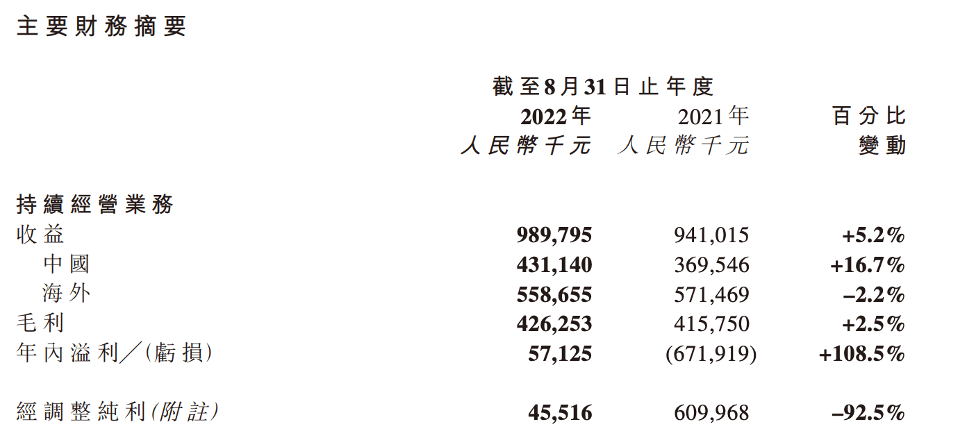 截至2022年8月31日及2021年8月31日止年度,本集團的收益分別為9.9億元及9.41億元。截至2022年8月31日止年度來自持續(xù)經(jīng)營業(yè)務的溢利為5710萬元及截至2021年8月31日止年度來自持續(xù)經(jīng)營業(yè)務的虧損為6.71億元。