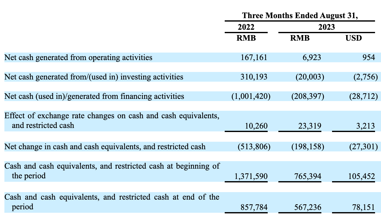 第四財季,博實樂經營活動產生現金凈流入692.3萬元,投資活動產生現金凈流出2000萬元,融資活動產生現金凈流出2.08億元。截至2023年8月31日,博實樂的現金、現金等價物、受限制現金合計5.67億元。