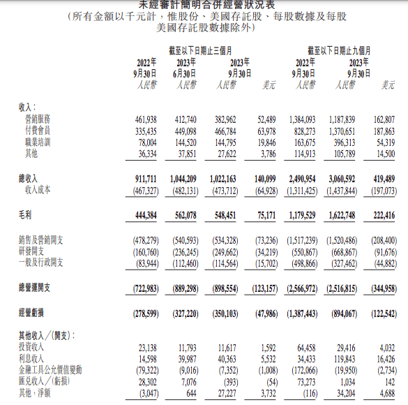 其中,營銷服務收入為3.83億元,上年同期為4.619億元;付費會員收入為4.668億元,同比增長39.2%,該增長主要受訂閱會員數量持續增長所帶動;職業培訓收入為1.448億元,同比增長85.6%,大幅增長主要由于其在線課程愈加豐富及新收購的業務于該期間帶來的收入貢獻所致;其他收入為2760萬元,上年同期為3630萬元。