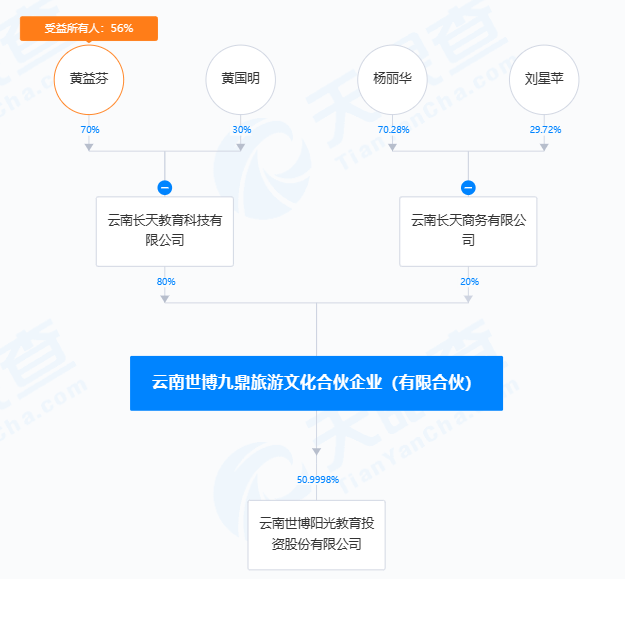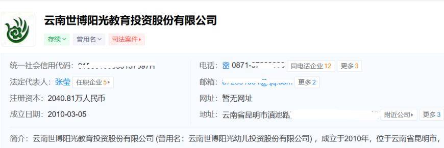 天眼查顯示,云南世博公司(曾用名:云南世博陽光幼兒投資股份有限公司、昆明陽光幼兒投資有限公司)成立于2010年3月5日,注冊資本2040.81萬元,法定代表人是張瑩,其是董事長兼總經理。