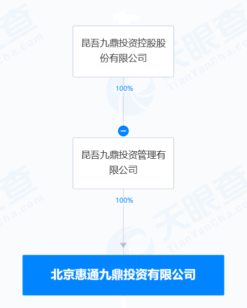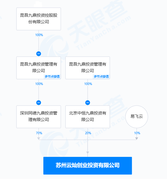 天眼查數據顯示,北京惠通九鼎是九鼎投資的全資子公司昆吾九鼎投資管理有限公司(以下簡稱“昆吾九鼎”)旗下持股100%的企業;蘇州云燦創投是昆吾九鼎旗下的深圳同德九鼎投資管理有限公司、北京中恒九鼎投資有限公司分別持股70%、20%的企業。