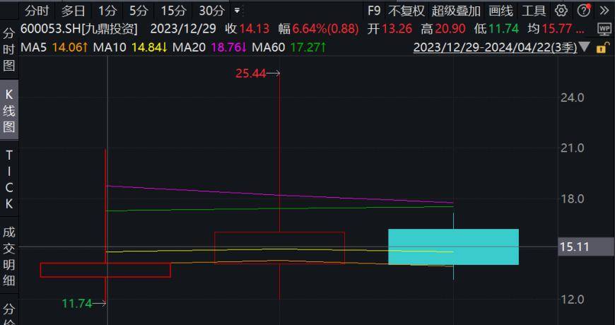 Wind數據顯示,九鼎投資2023年第四季度的最高價為20.90元,最低價為11.74元,成交均價約為15.77元/股。
