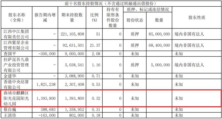 九鼎投資近日披露的2023年年報顯示,曲靖市麒麟區陽光花園陽光幼兒園(以下簡稱“陽光花園陽光幼兒園”)以持有139.38萬股成為公司第七大股東。