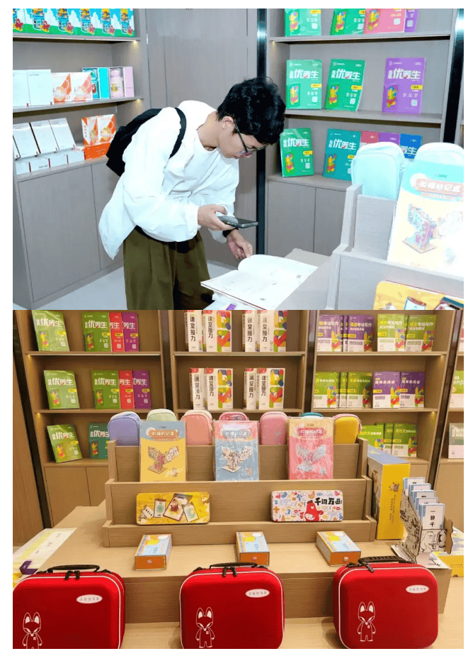 店內(nèi)一層展陳著全品文教旗下教輔圖書、學生用品等多款產(chǎn)品。