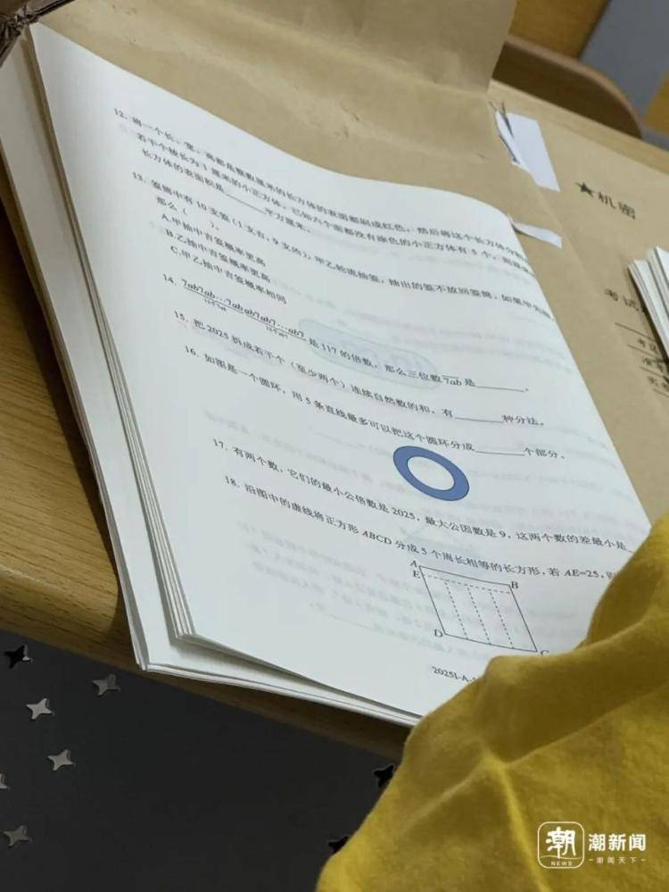考場內(nèi)氣氛緊張,考場外家長焦灼等待,他們深知題目不簡單。記者在監(jiān)考老師處瞥見的試卷印證了這點:題目遠超小學(xué)常規(guī)范疇,如:“把2025拆成若干個(至少兩個)連續(xù)自然數(shù)的和,有——種分法”、“有兩個數(shù),最小公倍數(shù)是2025,最大公因數(shù)是9,這兩個數(shù)的差最小是——”。