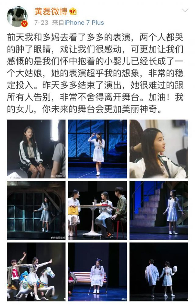 還記得前一段時間,黃磊的微博上曬出了自己的女兒第一次參加話劇表演的照片,贊許道: